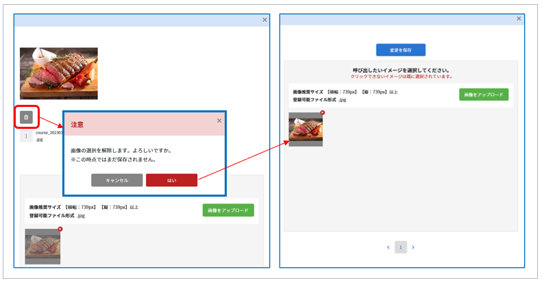 削除する画像の「×」をクリックすると削除確認画面が表示されますので、【はい】ボタンをクリックしてください。 削除が実行されます。