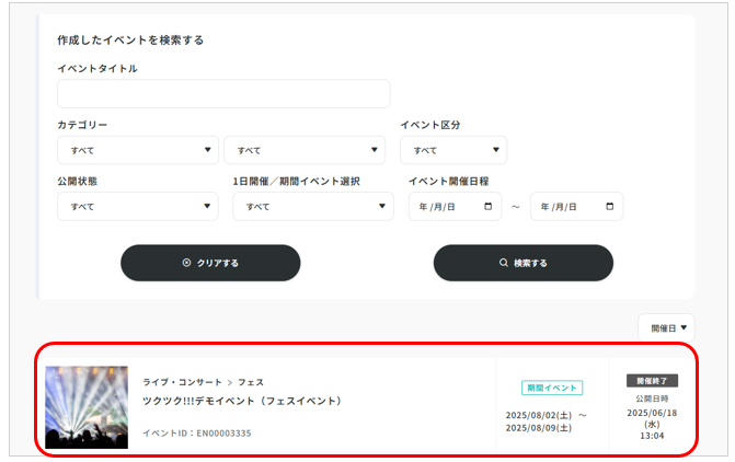 作成したイベントの「公開ステータス・タイトル・サムネイル・イベント期間・公開日時」をご確認いただけます。
