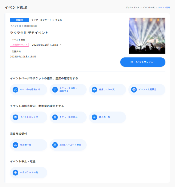イベントの開催日時や、チケットの販売期間を確認することができます。