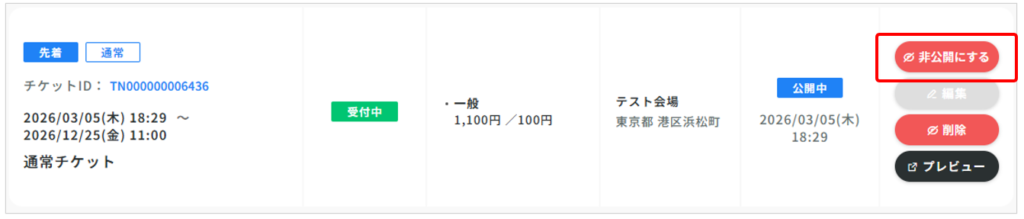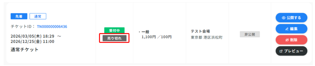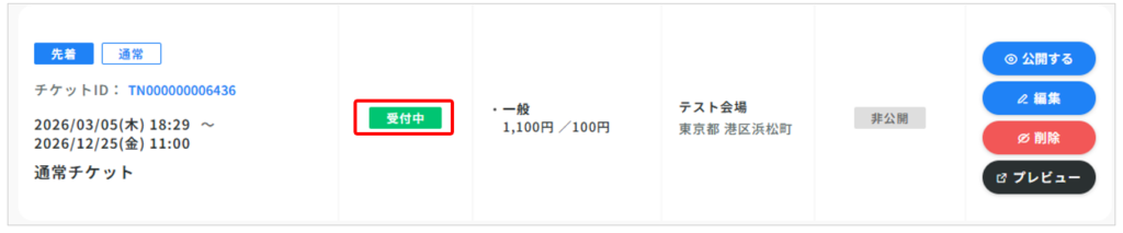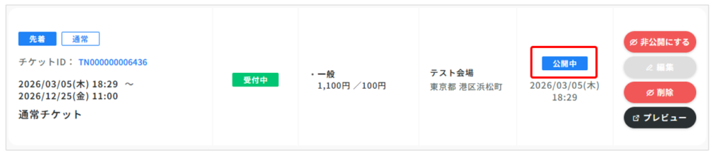 該当のチケットが「公開」となり、購入可能な状態となります。