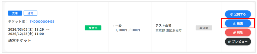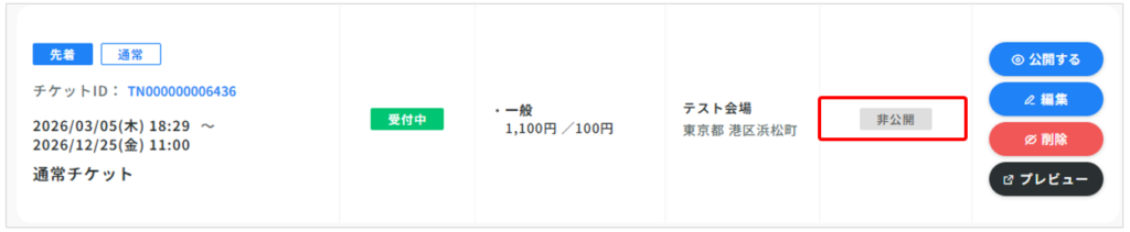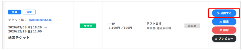 ⑥チケット一覧画面に戻るので、該当のチケット欄にある【公開する】ボタンをクリックすると、編集後のチケットを販売することができます。