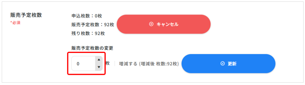 ②「販売予定枚数の変更」の項目が表示されるので、増やす、または減らす分の数字を黒三角(▲▼)にて数字を設定してください。