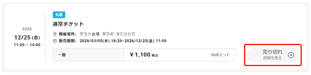 該当のチケットが公開された場合、イベント情報ページでは【売り切れ】と表示されます。