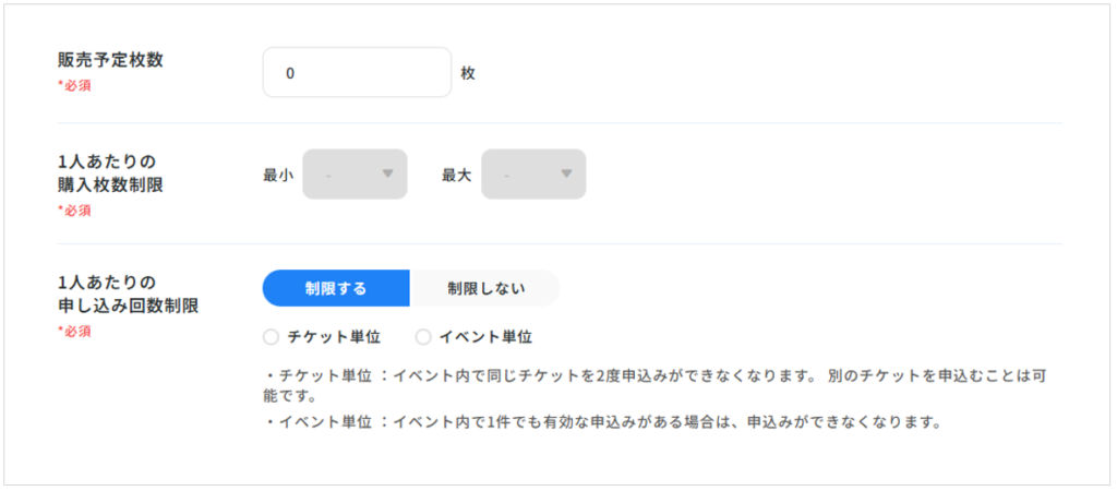 1人あたりの購入枚数制限…以下の通り、チケット枚数の制限をかけることができます。