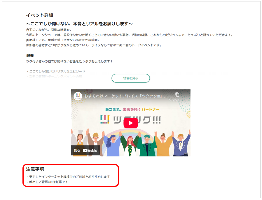 イベントの注意事項・ご必要なもの・イベント中止の条件 などをご入力ください。