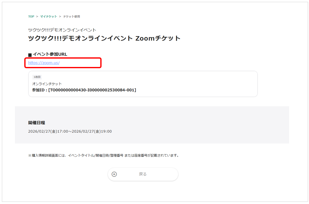 購入者がオンラインイベントに参加するために必要な情報(URL、ID、パスコードなど)を入力してください。 チケット購入後のチケット使用画面に表示されます。 |