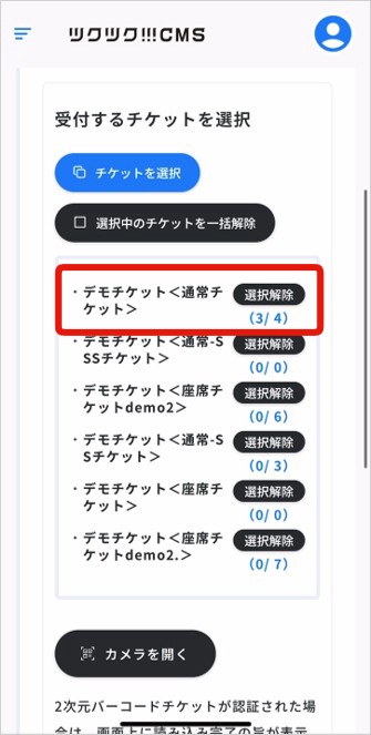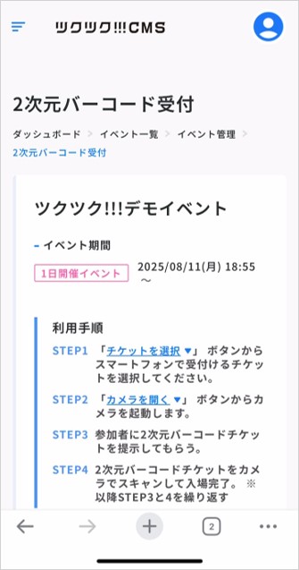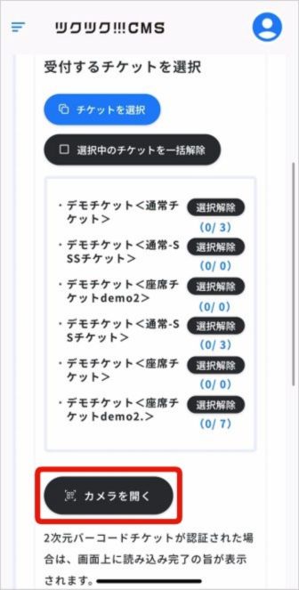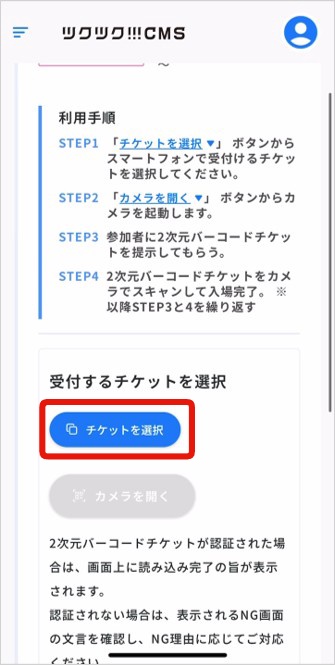 来場を受け付けるチケット選択→カメラ起動→2次元バーコード読み取り