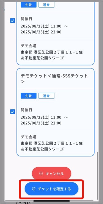 ④受付するチケットを選択し【チケットを確定する】ボタンを押してください。