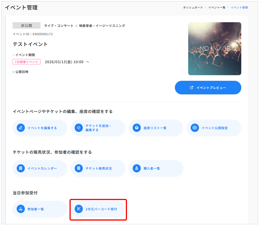 ダッシュボード>イベント一覧>イベント管理>2次元バーコード受付