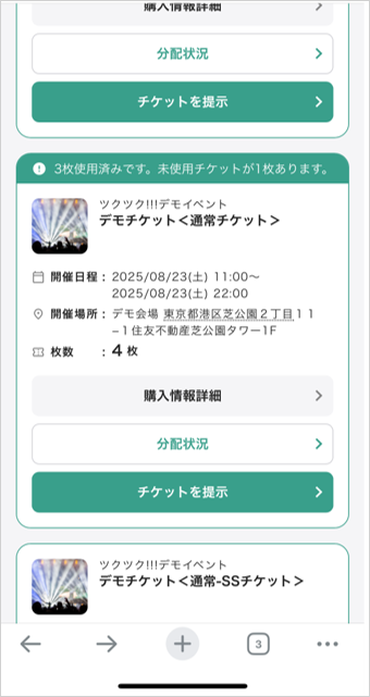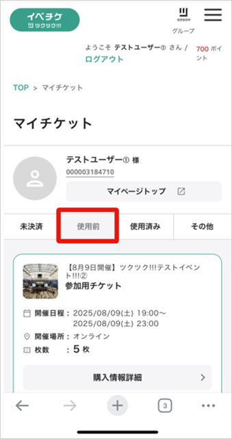 ➀ツクツク!!!イベチケのマイチケットより「使用前」タブを開いてください。
