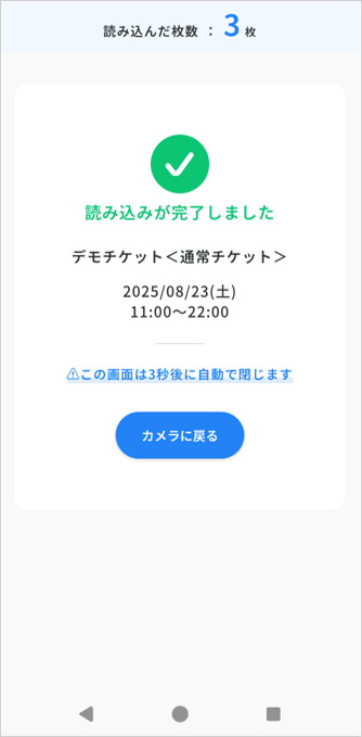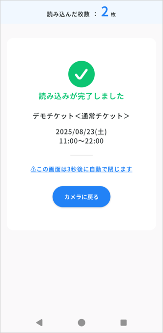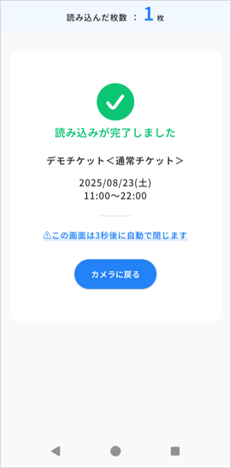 ※読み取りが完了すると、赤枠の入場数が加算されます。