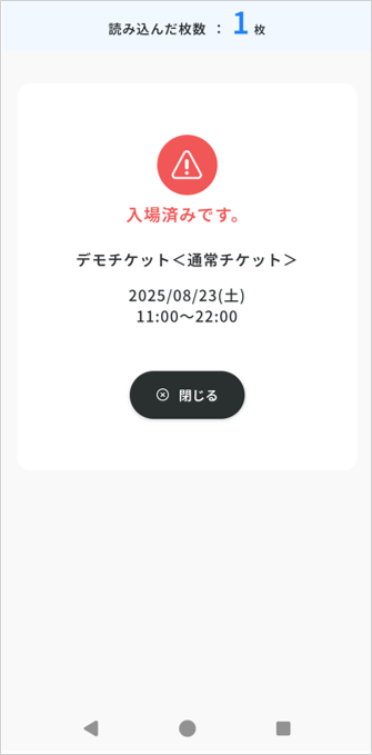 入場済みと表示されます。【閉じる】を押して、未入場の2次元バーコードを読み込んでください。