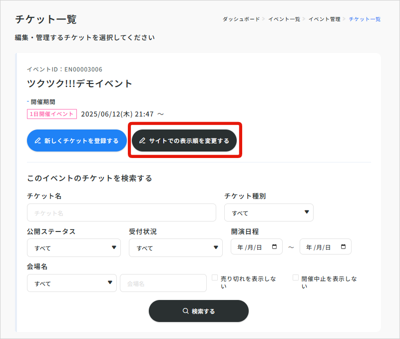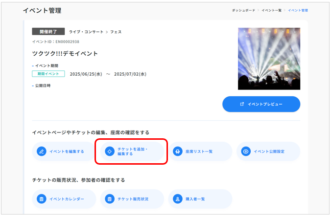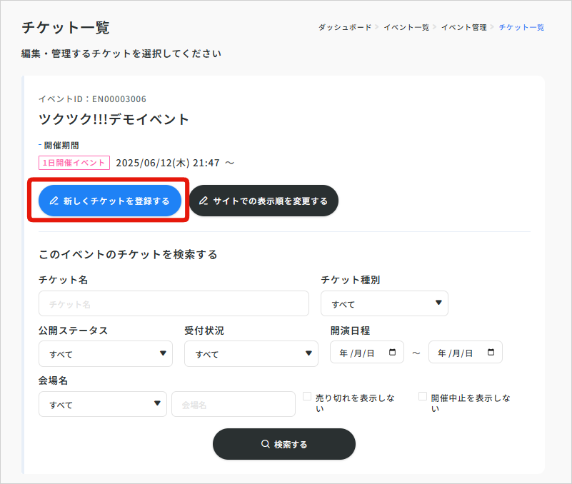 ダッシュボード>イベント一覧>イベント管理>チケット一覧