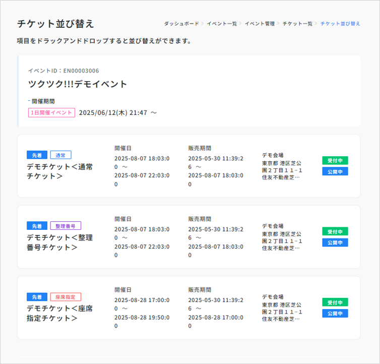 ②チケット並び替え画面が表示されます。チケット部分をドラッグ&ドロップで並び順を変更してください。